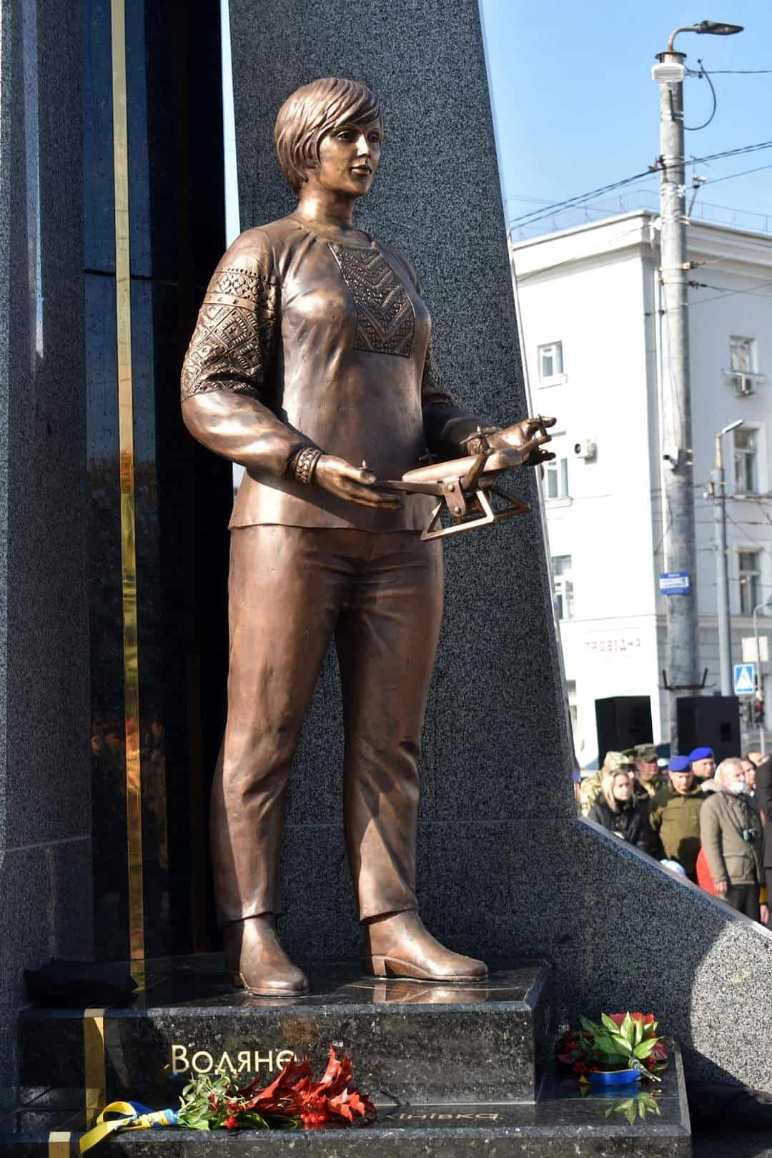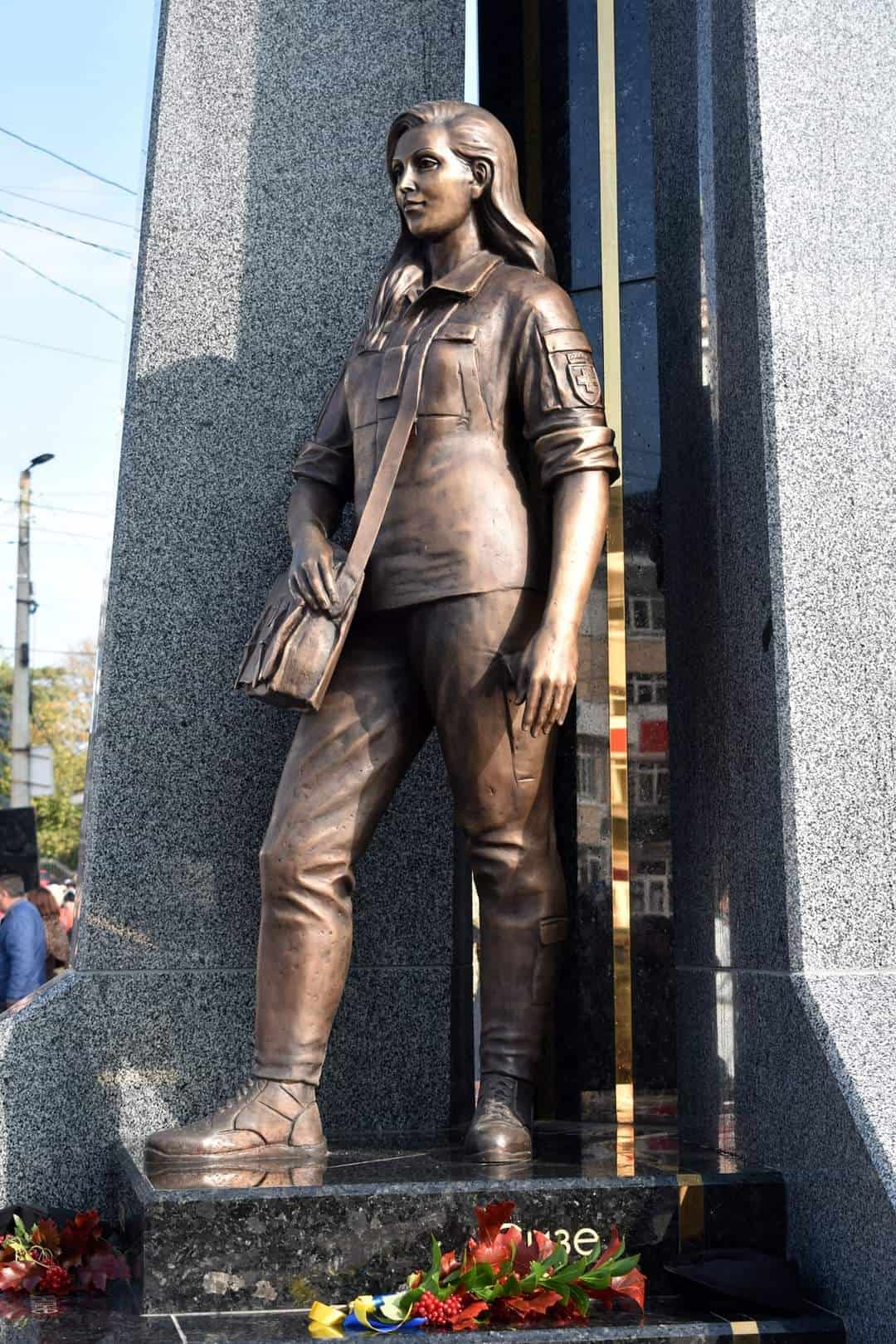 «Із кожної сторони монументу зображені бронзові фігури. Солдат стоїть на сторожі нашої держави; волонтер має образ жінки у вишиванці, що символізує її патріотизм; медсестра – це уособлення молодої дівчини, яка поїхала рятувати життя наших воїнів; доброволець – це людина з народу, яка за покликом серця поїхала захищати свою державу», – розповіла Євпак, пише Укрінформ.