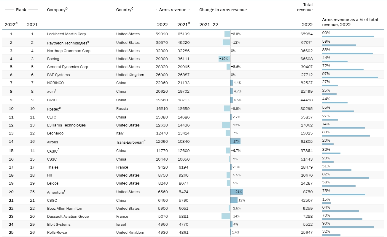 Згідно з поданими SIPRI даними від найбільших світових виробників продукції військового призначення, виторг від продажів озброєнь і послуг 100 найбільших компаній у галузі у 2022 році склала 597 млрд доларів, що на 3,5% менше, ніж у 2021 році, навіть попри різке зростання попиту.