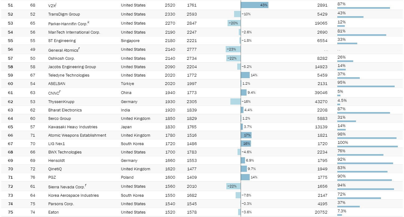 На їхню частку припадає 51% загальних доходів від продажу зброї у Топ-10». З 42 американських компаній 32 зафіксували падіння доходів від продажу озброєнь, найчастіше посилаючись на поточні проблеми з ланцюжками поставок та нестачу робочої сили, викликану пандемією COVID-19.